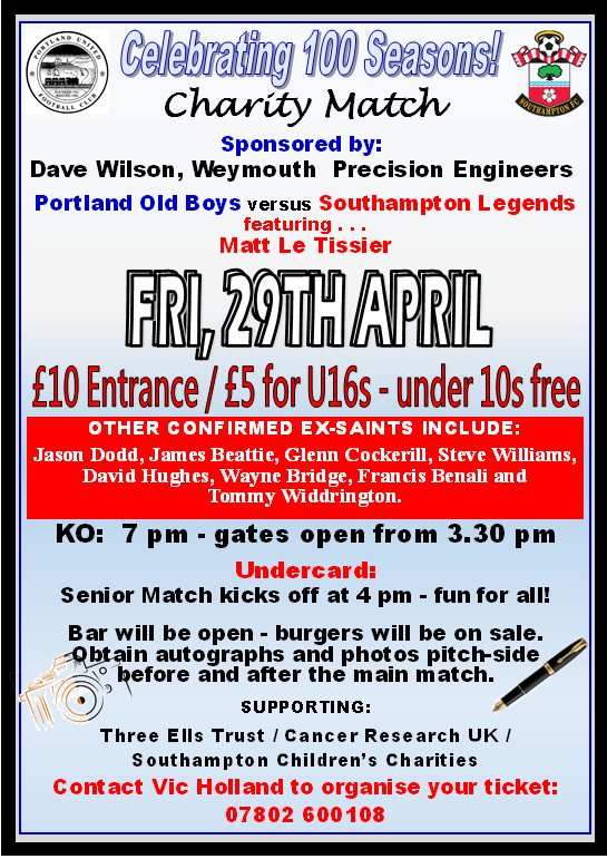 With the lighter evenings coming who is ready for some Ex-Saints Legends matches, with some archive members playing? 1st up an evening in Portland on Friday 29th April with kick off at 7pm. Ticket details on the poster. A coach is being planned to help supporters get down to Portland .. more details to follow.